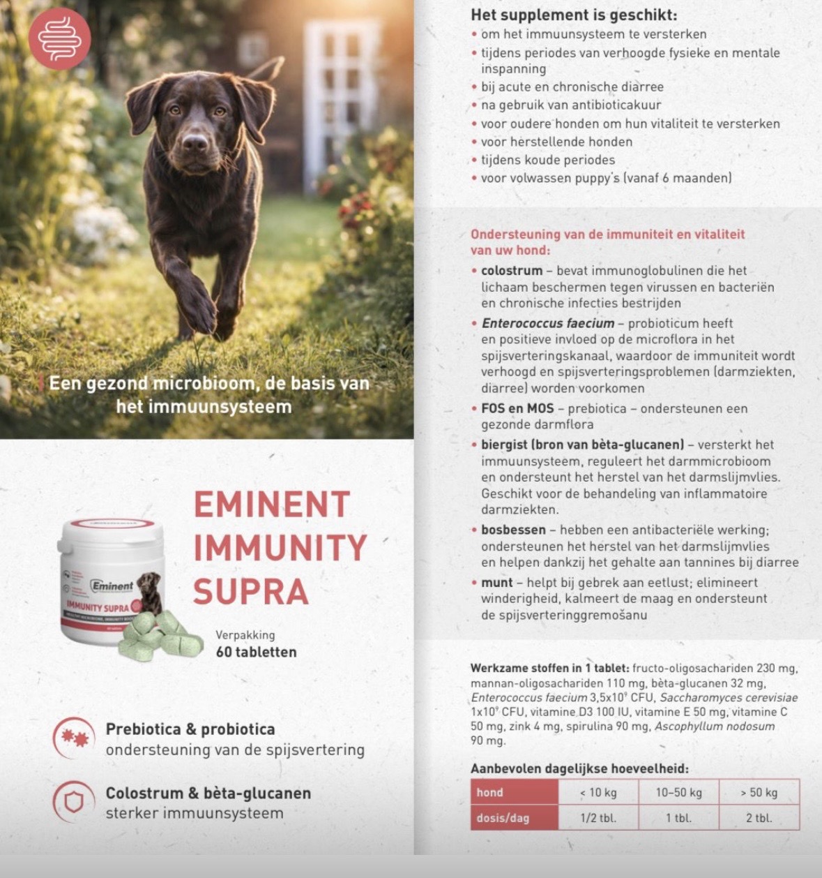 Werkzame stoffen per tablet: Fructo-oligosachariden 230 mg, mannan-oligosachariden 110 mg, bèta-glucanen 32 mg, Enterococcus faecium 3,5×10⁹ CFU, Saccharomyces cerevisiae 1×10⁹ CFU, vitamine D3 100 IU, vitamine E 50 mg, vitamine C 50 mg, zink 4 mg, spirulina 90 mg, Ascophyllum nodosum 90 mg.