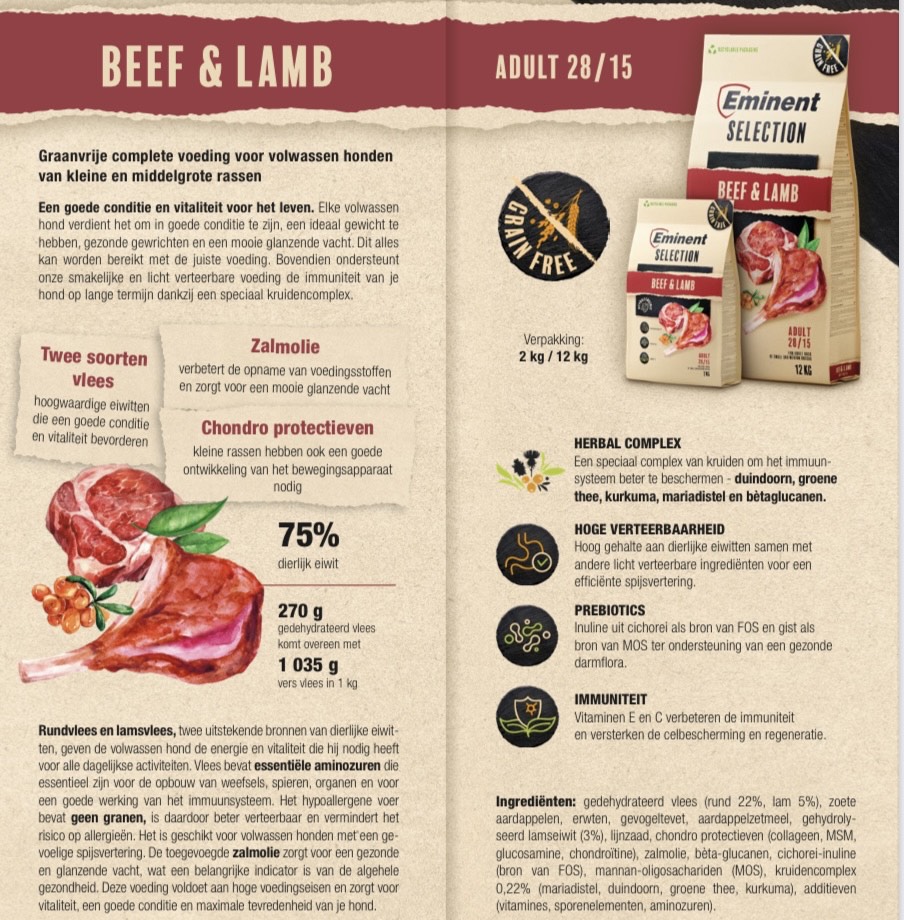 Ingrediénten: gedehydrateerd vlees (rund 22%, lam 5%), zoete aardappelen, erwten, gevogeltevet, aardappelzetmeel, gehydrolyseerd lamseiwit (3%), lijnzaad, chondroprotectiva (collageen, MSM, glucosamine, chondroitine), zalmolie, béta-glucanen, cichorei-inuline (bron van FOS), mannan-oligosachariden (MOS), kruidencomplex 0,22% (mariadistel, duindoorn, groene thee, kurkuma), additieven (vitamines, sporenelementen, aminozuren).