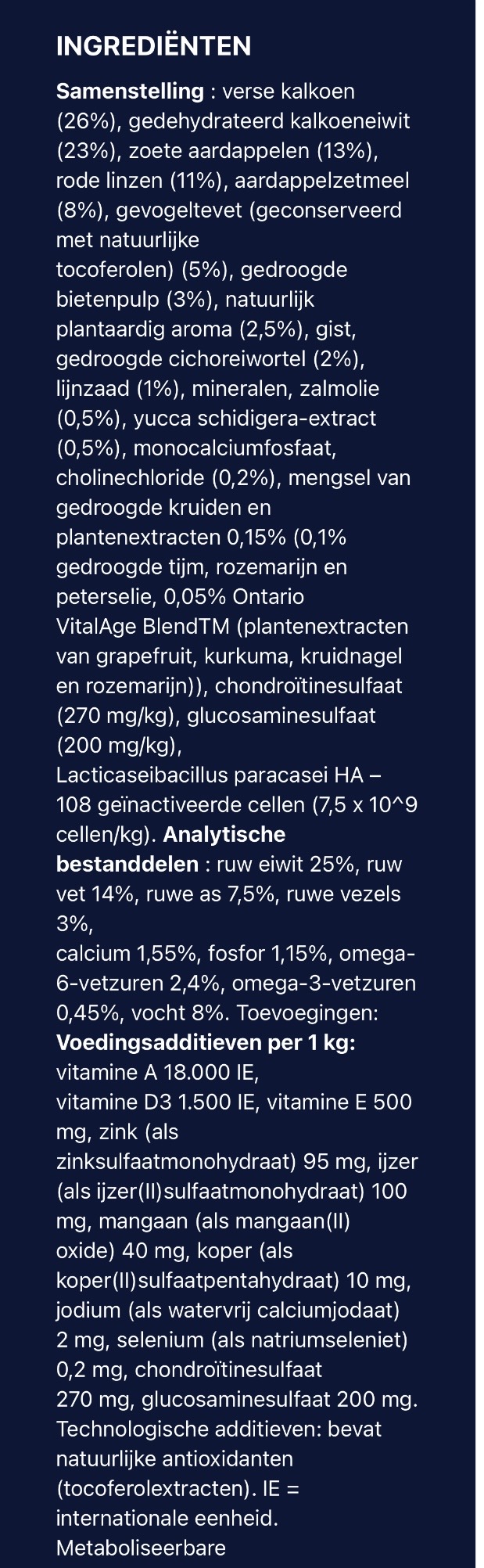 Samenstelling: verse kalkoen (26%), gedehydrateerd kalkoenprotein (23%), zoete aardappelen (13%), rode linzen (11%), aardappelzetmeel (8%), pluimveevet (geconserveerd met natuurlijke tocoferolen) (5%), gedroogde bietenpulp (3%), natuurlijk plantaardig aroma (2,5%), gist, gedroogde chicorei wortel (2%), lijnzaad (1%), mineralen, zalmolie (0,5%), yucca schidigera extract (0,5%), monocalciumfosfaat, cholinechloride (0,2%), blend van gedroogde kruiden en plantenextracten 0,15% (0,1% gedroogde tijm, rozemarijn en peterselie, 0,05% Ontario VitalAge Blend™ (plantenextracten van grapefruit, kurkuma, kruidnagel en rozemarijn)), chondroïtinesulfaat (270 mg/kg), glucosaminesulfaat (200 mg/kg), Lacticaseibacillus paracasei HA-108 geïnactiveerd (7,5 x 10^9 cellen/kg).