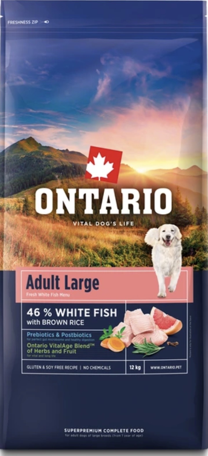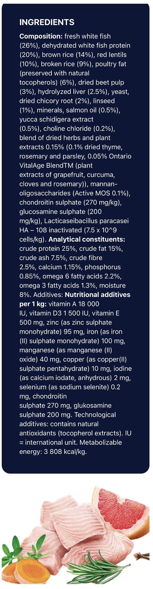 Samenstelling: vers witvis (26%), gedehydrateerd witvisprotein (20%), zilvervliesrijst (14%), rode linzen (10%), gebroken rijst (9%), pluimveevet (geconserveerd met natuurlijke tocoferolen) (6%), gedroogde bietenpulp (3%), gehydrolyseerde lever (2,5%), gist, gedroogde chicorei wortel (2%), lijnzaad (1%), mineralen, zalmolie (0,5%), yucca schidigera extract (0,5%), cholinechloride (0,2%), blend van gedroogde kruiden en plantenextracten 0,15% (0,1% gedroogde tijm, rozemarijn en peterselie, 0,05% Ontario VitalAge Blend™ (plantenextracten van grapefruit, kurkuma, kruidnagel en rozemarijn)), mannan-oligosachariden (Active MOS 0,1%), chondroïtinesulfaat (270 mg/kg), glucosaminesulfaat (200 mg/kg), Lacticaseibacillus paracasei HA-108 geïnactiveerd (7,5 x 10^9 cellen/kg).