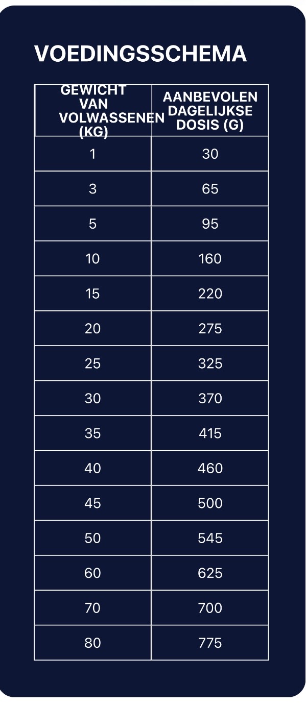 Technologische additieven: bevat natuurlijke antioxidanten (tocoferolextracten). IE = internationale eenheid. Metaboliseerbare energie: 3.808 kcal/kg.