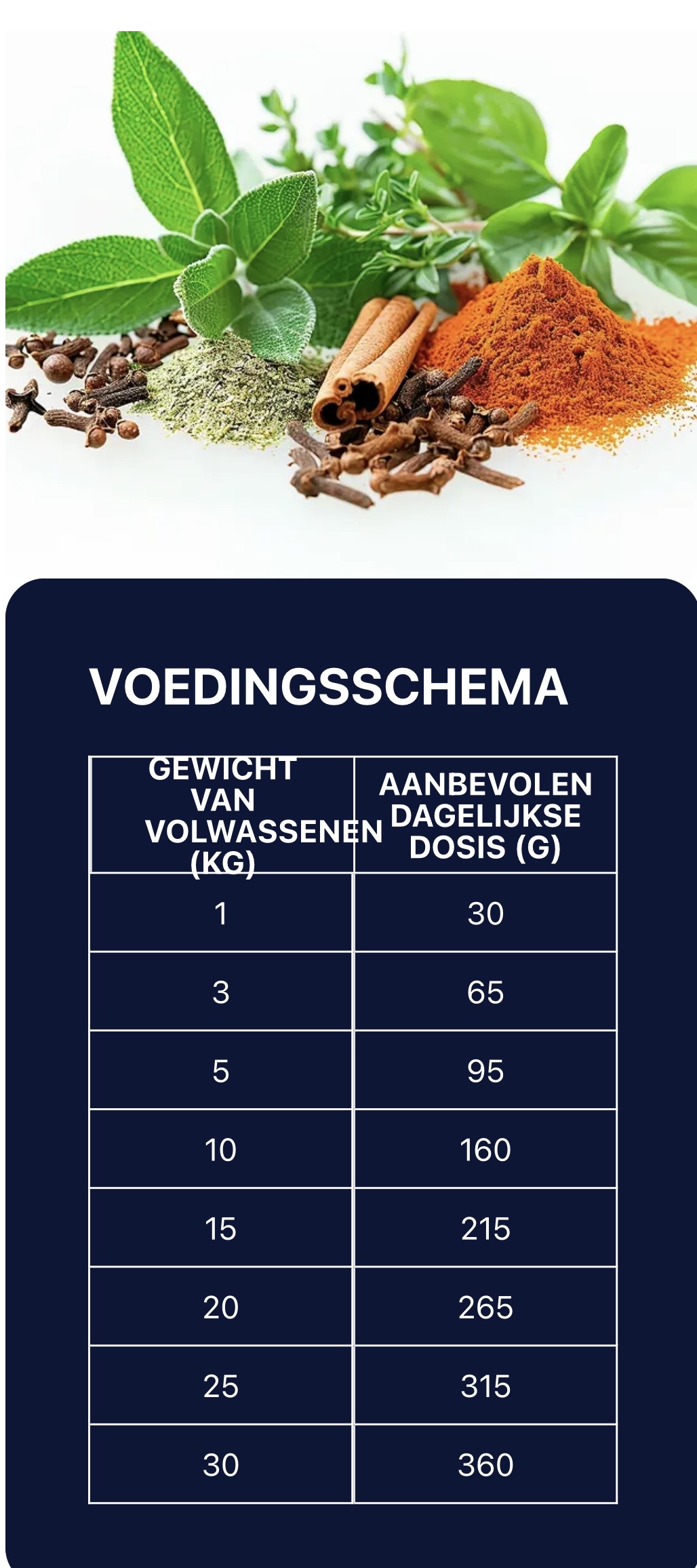 Technologische additieven: bevat natuurlijke antioxidanten (tocoferolextracten). IE = internationale eenheid. Metaboliseerbare energie: 3.901 kcal/kg.