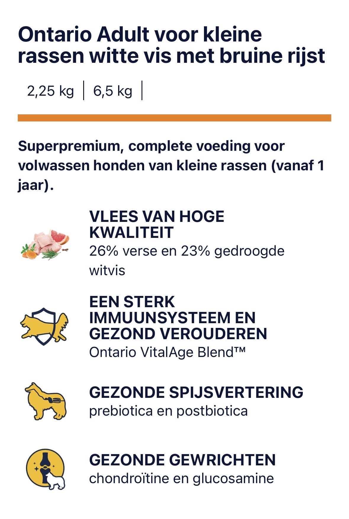 Samenstelling: vers witvis (26%), gedehydrateerd witvisprotein (23%), rode linzen (11%), zilvervliesrijst (9%), gebroken rijst (8%), pluimveevet (geconserveerd met natuurlijke tocoferolen) (7%), gedroogde bietenpulp (3%), gehydrolyseerde lever (2,5%), gist, erwtenprotein, gedroogde chicorei wortel (2%), lijnzaad (1%), mineralen, zalmolie (0,5%), yucca schidigera extract (0,5%), cholinechloride (0,2%), blend van gedroogde kruiden en plantenextracten 0,15% (0,1% gedroogde tijm, rozemarijn en peterselie, 0,05% Ontario VitalAge Blend™ (plantenextracten van grapefruit, kurkuma, kruidnagel en rozemarijn)), mannan-oligosachariden (Active MOS 0,1%), chondroïtinesulfaat (270 mg/kg), glucosaminesulfaat (200 mg/kg), Lacticaseibacillus paracasei HA-108 geïnactiveerd (7,5 x 10^9 cellen/kg).